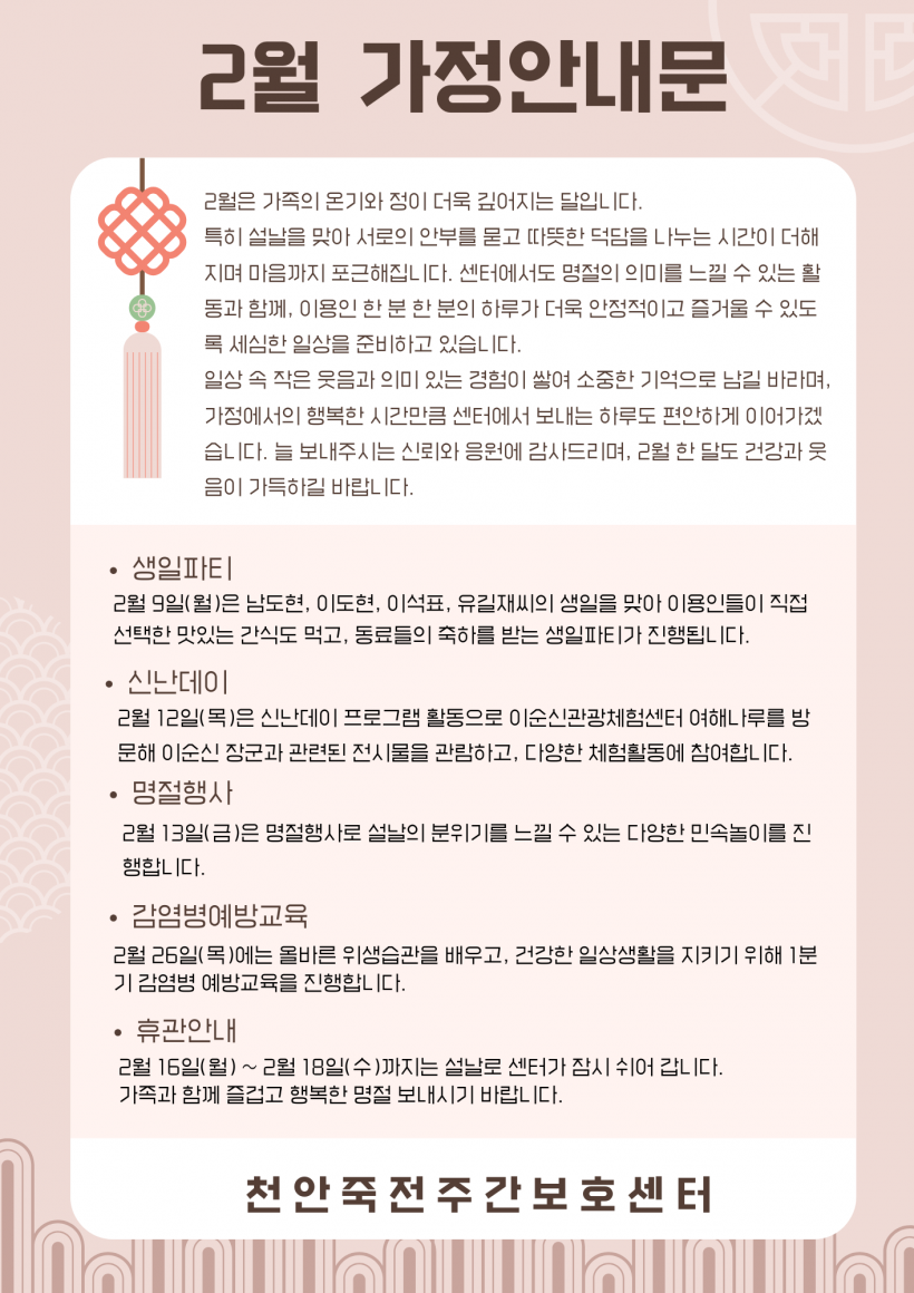 2026년 2월 가정안내문 페이지 정보 작성자 김미리 작성일26-01-29 16:17 조회24회 댓글0건 다음글 목록 본문 2월 가정안내문입니다. 댓글목록 등록된 댓글이 없습니다. 다음글 목록