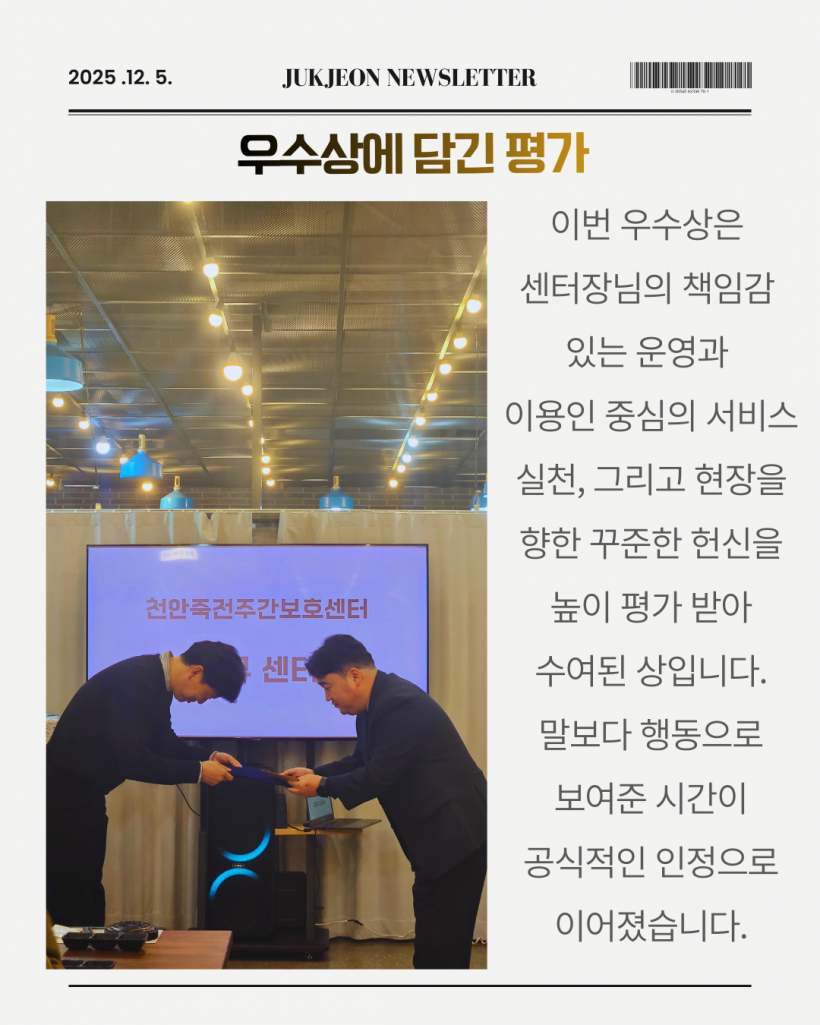 2025년 충청남도장애인주간보호시설협회 송년회에서 기쁜 소식이 전해졌습니다. 한국장애인주간이용시설협회가 수여하는 우수상을 우리 센터 센터장님께서 수상하셨습니다. 이번 수상은 이용인 중심의 운영과 현장을 향한 꾸준한 책임감, 그리고 묵묵히 이어온 리더십의 공로를 공식적으로 인정받은 결과입니다.