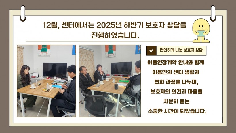 우리 센터에서는 2025년 하반기 보호자 상담을 통해 이용인의 안정적인 이용과 건강한 일상을 함께 고민하는 시간을 가져보았습니다.