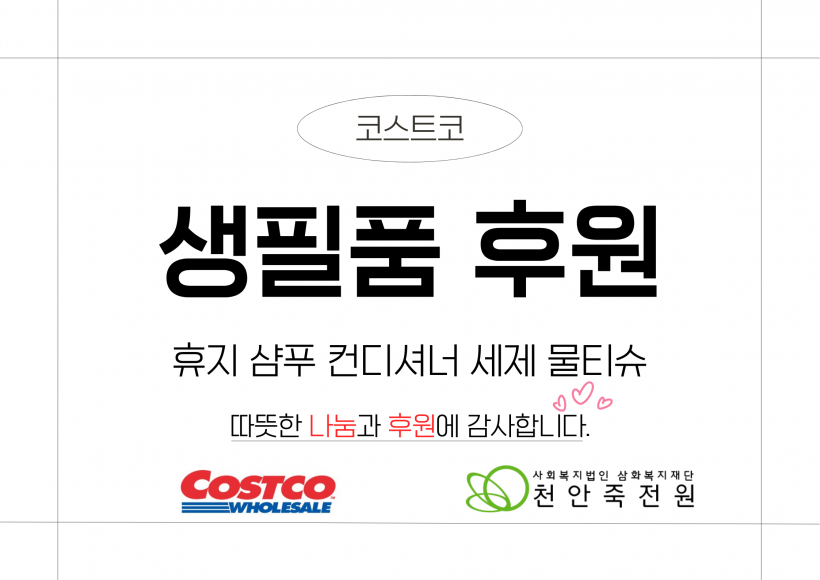 코스트코 생필품 후원 페이지 정보 작성자 운영자 작성일26-02-05 14:15 조회172회 댓글0건 관련링크 목록 본문 26.02.04.(수)코스트코 천안지점에서 휴지, 샴푸, 컨디셔너, 세제, 물티슈를 후원해주셨습니다.천안죽전원 가족분들이 일상생활에서 잘 사용하실 수 있도록 지원하겠습니다.천안죽전원에게 사랑과 나눔을 해주신 코스트코에게 다시한번 감사의 말씀을 드립니다.감사합니다. 댓글목록 등록된 댓글이 없습니다. 목록