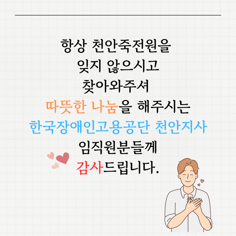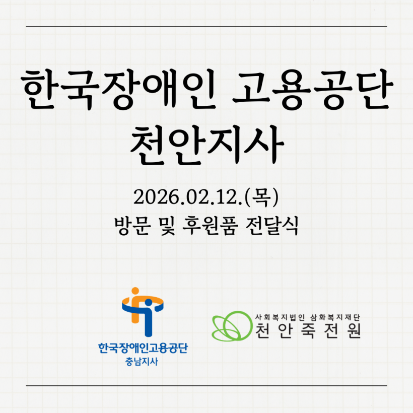한국장애인고용공단 천안지사 방문 페이지 정보 작성자 운영자 작성일26-02-23 16:00 조회18회 댓글0건 관련링크 목록 본문 26.02.12.(목)한국장애인고용공단 천안지사에서 임직원분들이 방문해주셨습니다.항상 따뜻한 관심과 소중한 나눔을 해주시는 한국장애인고용공단 천안지사 임직원 분들께 감사드립니다. 댓글목록 등록된 댓글이 없습니다. 목록