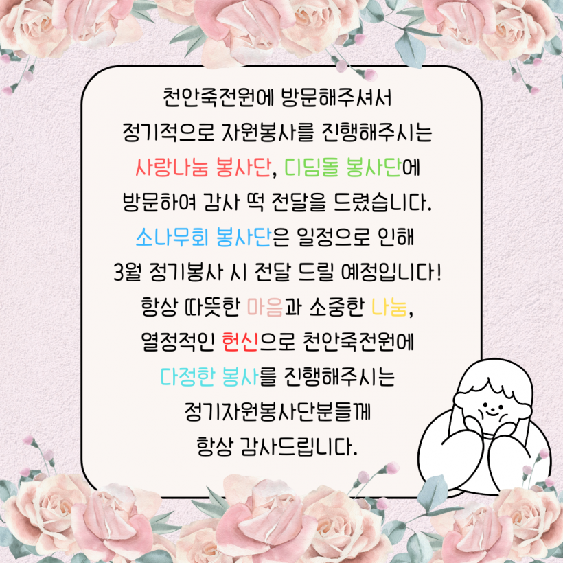 정기자원봉사단 감사 떡 전달 페이지 정보 작성자 운영자 작성일26-02-23 16:50 조회15회 댓글0건 관련링크 목록 본문 26.02.13.(금)설 명절을 앞두고 정기자원봉사단분들께 감사 떡을 전달드리고 왔습니다.이용자분들과 함께 방문하여 감사 인사를 드리고 감사 인사를 드렸습니다.항상 천안죽전원에 다정한 봉사를 진행해주시는 정기자원봉사단분들께다시한번 감사 인사를 드립니다. 댓글목록 등록된 댓글이 없습니다. 목록